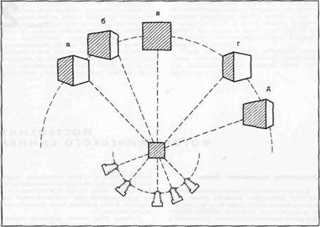 При постепенном смещении точки съемки в стороны от центрального положения становится видимой вторая плоскость, ограничивающая объем предметов и фигур, составляющих объект съемки (рис. 1, фигуры б, г, д). Благодаря тому что на рисунке теперь видны и две стороны предметов и стыки этих сторон (грани предметов), их объемы и формы выражаются полнее.