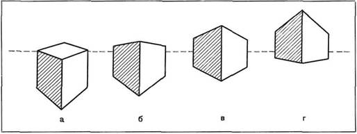 В фигуре в, где линия горизонта проходит посередине, перспективное сокращение верхних и нижних граней куба одинаково. При этой точке съемки, обусловливающей средний горизонт в кадре, изображение получается нормальным и никакой особой характеристики не приобретает.