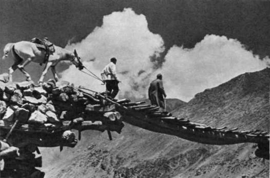 Снимок В. Шаховского "Старый мостик в горах" (фото 25) сделан с нижней точки. Изображенные на снимке мостик, фигуры людей и лошади проецируются на фон облаков и вершин холмов. В результате подчеркивается высота мостика и своеобразие его конструкции, и нижняя точка съемки, следовательно, использована для решения смысловых и изобразительных задач, выбрана исходя из содержания снимка. Таким образом, она здесь вполне оправданна.