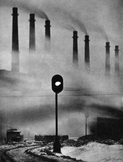 Так, В. Тарасевич не случайно выбирает вертикальный формат для своего снимка "Зеленая улица" (фото 32). Вертикальный формат изображения здесь подсказан высотой самого объекта съемки: действительно, словно в небо уходят дымящиеся трубы завода-гиганта. При установленной высоте кадра можно было раздвинуть его вертикальные границы и скомпоновать снимок в горизонтальном формате. Но тогда угол зрения объектива охватил бы значительно большее пространство и в обилии показанного материала исчез бы акцент на светофоре с его зеленым огоньком. А вместе с этим пропала бы и четкость выражения темы, так как она раскрывается здесь именно в активном сопоставлении двух элементов композиции – завода-гиганта в глубине кадра и светофора на переднем плане – и читается лаконично, как плакат: "Зеленую улицу семилетке советской промышленности!" Вертикальный формат, следовательно, помогает выражению содержания этого снимка.
