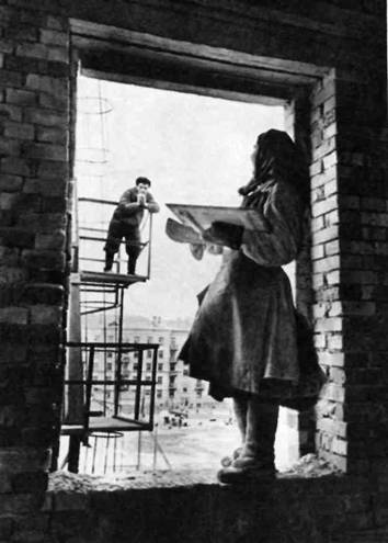 Если теперь проанализировать линейный строй снимка, то становится очевидным, что каждый из элементов композиции как своим размещением в кадре, так и своим линейным рисунком связан с другими её элементами. Местоположение границ кадра здесь найдено очень точно: ни одна из них не может быть сдвинута без того, чтобы снимок не потерял какого-то важного компонента, или без того, чтобы в кадр не включились ненужные свободные пространства, а композиция не утратила своей завершенности. Каждая из этих границ обусловлена размещением фигур в кадре. Здесь нельзя найти такой линии, по которой кадр делился бы на две или несколько самостоятельных частей: цельность композиции, её конструктивная прочность не допускают распадения картины.