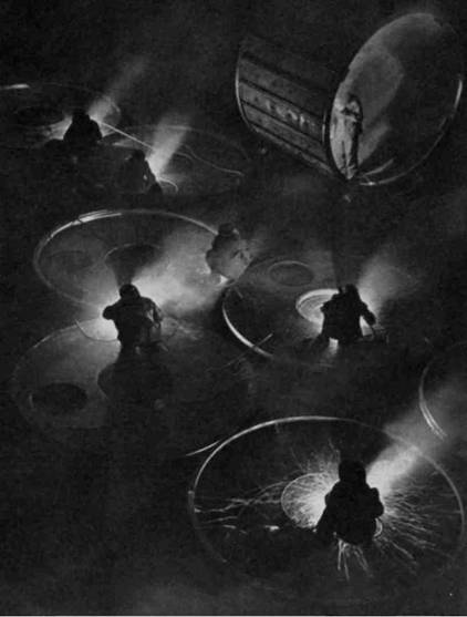 Вместе с тем, несмотря на прямую репортажность съемки, фото 93 не случайно по построению, его композиция и световой рисунок найдены очень точно. Верхняя точка съемки позволила развернуть действие на всем пространстве, охватываемом углом зрения объектива, и получить стройный линейный рисунок кадра, основанный на ритме овальных фигур, масштабно сокращающихся от переднего плана в глубину. Выявлению этих линий помог свет, очертивший фигуры четкими контурами. Свет дал возможность получить акценты на главных объектах изображения, отделить работающих людей от близкого к ним по тональности фона. Яркие световые блики и небольшое количество рассеянного света обусловливают довольно высокий контраст изображения и общую его темную тональность. Эта световая обстановка делает репортажный снимок живописной фотографической картиной действительности.