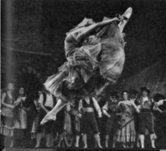 На фото 96 воспроизводится одна из сцен балета "Раймонда". Балерина Черкасова показывается в полном легкости и изящества полете, причем и здесь автором снимка точно выбрана фаза движения, на которую приходится момент спуска затвора фотоаппарата. На снимке дается не кульминационная точка прыжка, которая на фотографии часто оказывается статичной, так как скорость движения в этой точке теряется, а выход из кульминационной точки движения. В результате движение на снимке получает направленность (налево и вниз), и уже одно это способствует динамичности снимка.
