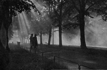 Так, структурным принципом фото 111 является контровой свет, который создает здесь полусилуэтное изображение. Такое освещение образует на снимке четкую градацию тонов от темных – на переднем плане к светлым – в глубине. Гармоничное сочетание тонов, мягкие тональные переходы и порядок в их распределении сообщают снимку тональную собранность и освобождают изображение от излишней пестроты, свойственной многим натурным снимкам. Конструктивная четкость и выразительность композиции усиливается еще и тем, что полусилуэтное изображение стволов деревьев и фигур людей хорошо выделяется здесь на фоне светлой воздушной дымки, словно задергивающей глубину кадра полупрозрачной пеленой.